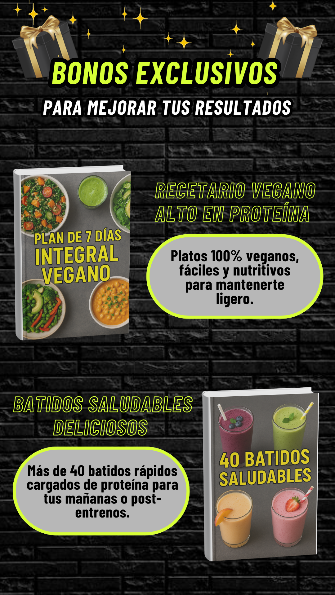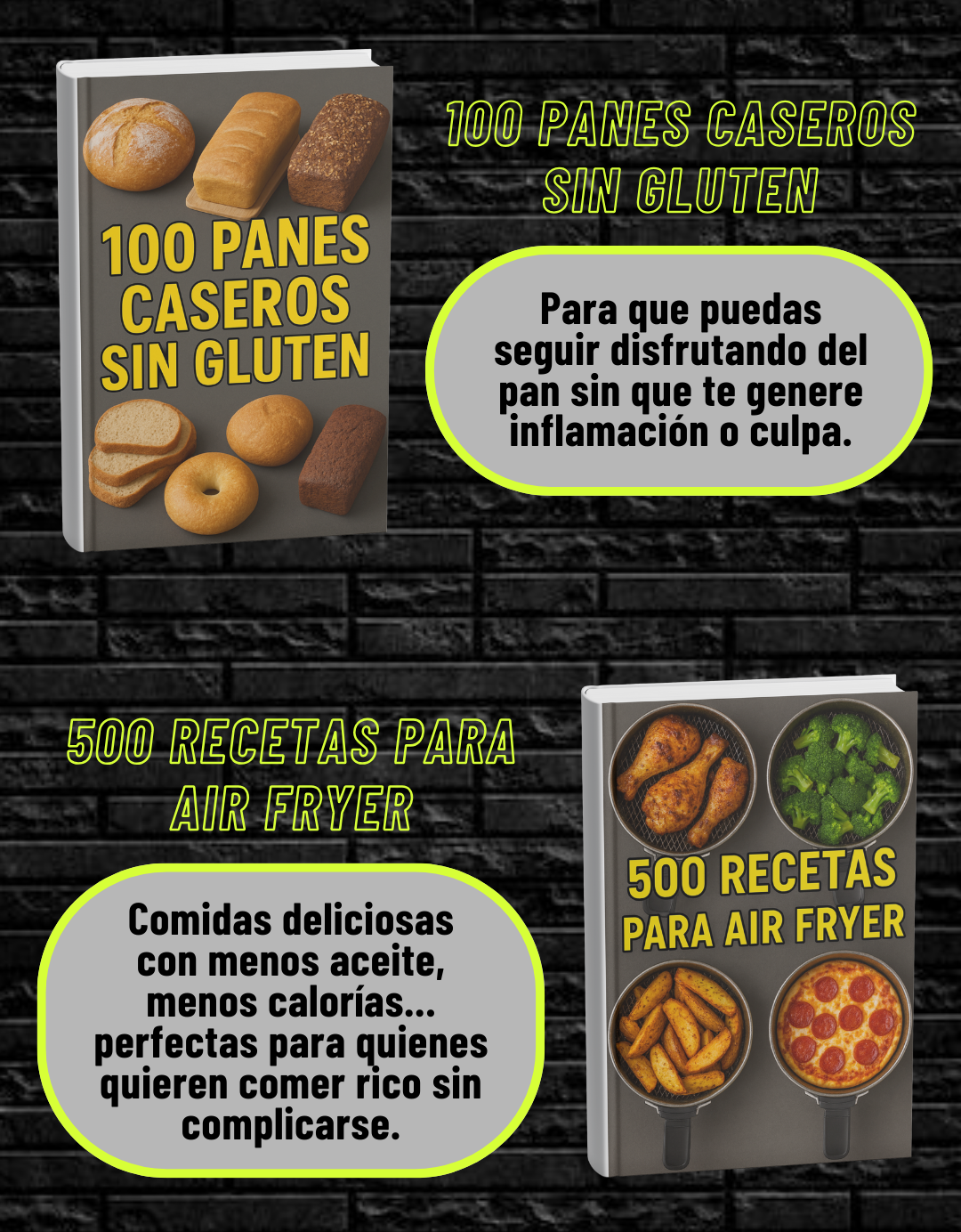 🎁 5 bonos extra: Videos GIF de ejercicios, 50 Recetas Veganas, 40 Recetas de Batidos Deliciosos, 500 Recetas para AirFryer, un Plan Keto de 28 días Y 100 Panes Caseros Sin Gluten.